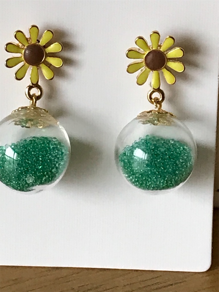 ひまわりのチャームと、石座カン付き(6ミリ)イヤリング金具、ガラスドームが、届いたので作ってみました。ひまわり+ガラスドームはお店のキッドセットで作りました。